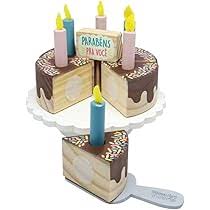 O kit inclui um bolo decorado com cobertura de chocolate, dividido em seis fatias unidas por velcro, cinco velas coloridas removíveis, uma plaquinha de "Parabéns pra Você" e uma espátula de servir. A criança pode montar, desmontar e "servir" as fatias como em uma comemoração real, estimulando a imaginação, a socialização e o desenvolvimento motor.
