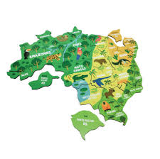 O mapa é dividido por cores que representam as regiões brasileiras (Norte, Nordeste, Centro-Oeste, Sudeste e Sul), com ilustrações de animais típicos e vegetações nativas, tornando o aprendizado ainda mais visual e envolvente. Cada peça representa um estado e ajuda no desenvolvimento do raciocínio lógico, da coordenação motora e do conhecimento geográfico.