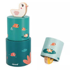 - A segunda é uma pirâmide redonda de 3 partes com tema de lago e 2 figuras de pato de madeira: ideal para estimular a coordenação motora fina e incentivar a interação com o bebê!
