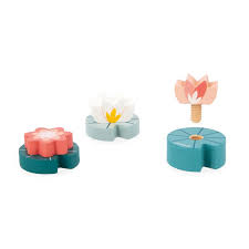 - Um brinquedo de parafuso contendo 3 nenúfares de diferentes formatos e diâmetros também é fornecido para os pequenos: eles têm a tarefa de prender cada flor na folha correta!