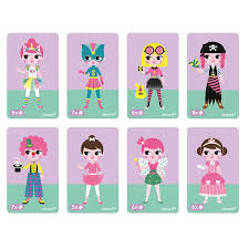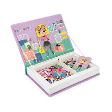 Jogo educativo magnético em papelão para meninas sobre o tema de trajes. Composto por 46 ímãs e 8 cartões. Após abrir o livro, o objetivo é criar no palco o mesmo traje indicado no cartão, graças aos ímãs.