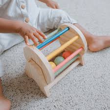 Tambor de madeira com barras coloridas e bolinhas internas que giram. Estimula o movimento, a coordenação motora e a percepção visual e auditiva.